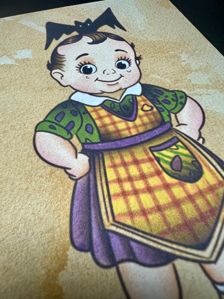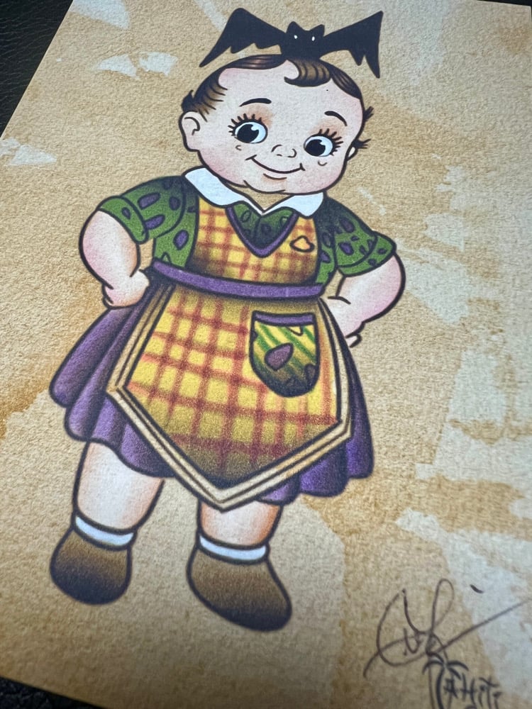 Spooky season meets sweet nostalgia! This 5x7” print reimagines a Mickey’s Not-So-Scary Halloween Party cast member costume in classic Kewpie doll style. With wide eyes, rosy cheeks, and a playful bat bow, this little cutie embodies the charm of the “Boo to You” parade and the festive spirit of Magic Kingdom’s Halloween celebration.