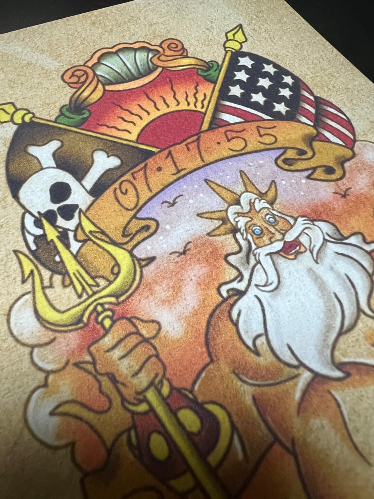 Where salty sailor tradition meets pure Disney magic. This 5x7” tattoo-flash inspired print reimagines the classic “Crossed the Equator” naval tattoo — a rite of passage for sailors — with King Triton at the helm. Surrounded by the rising sun, nautical banners, skull-and-crossbones, and the date 07-17-55 (Disneyland’s opening day), this piece honors both seafaring heritage and Disney legacy.
