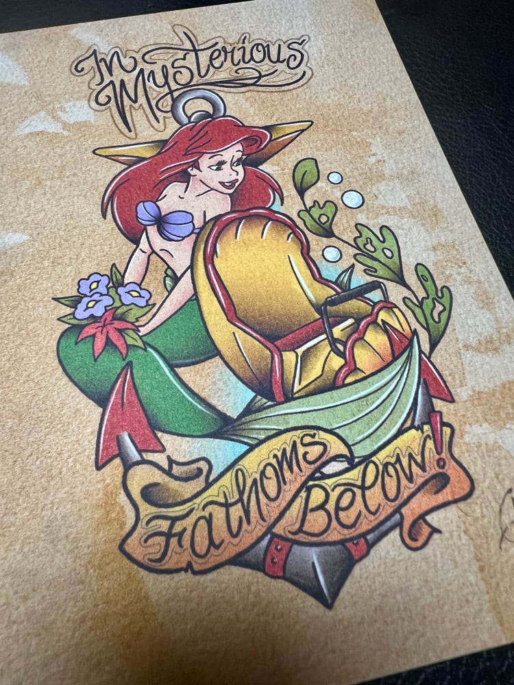 Dive under the sea with this 5x7” tattoo-flash inspired tribute to Disney’s The Little Mermaid: Ariel’s Undersea Adventure. Featuring Ariel herself alongside the seashell ride vehicle, waves, and nautical flourishes, this piece captures the magic and music of the classic tale brought to life in Disney Parks.