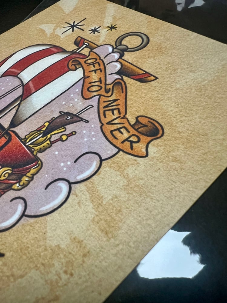 Sail high above London and into the stars with this 5x7” tattoo-flash inspired tribute to Disney’s Peter Pan’s Flight. Featuring the Jolly Roger ship, starlit skies, and a bold anchor motif, this piece captures the timeless wonder of flying off to Neverland.