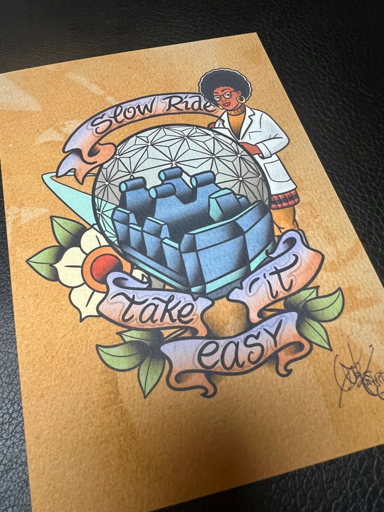 Celebrate Epcot’s iconic Spaceship Earth with this 5x7” tattoo-flash inspired print. Featuring the legendary geodesic sphere, ride vehicles, and a retro-futuristic scientist guide, this design captures the timeless journey through communication and human history. With its bold lines, classic banner styling, and pops of vintage color, it’s a tribute to one of Disney’s most enduring attractions.