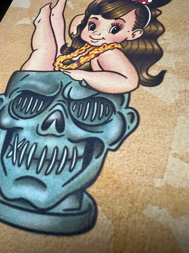 Aloha, adventurers! This 5x7” print reimagines the legendary Trader Sam’s Enchanted Tiki Bar vibes in vintage Kewpie doll form. Featuring a playful Minnie-eared Kewpie lounging atop the iconic Zombie Head mug with lei in tow, it’s a cheeky nod to Disney’s tiki culture, mixology magic, and cast members who bring the fun to life with every pour.