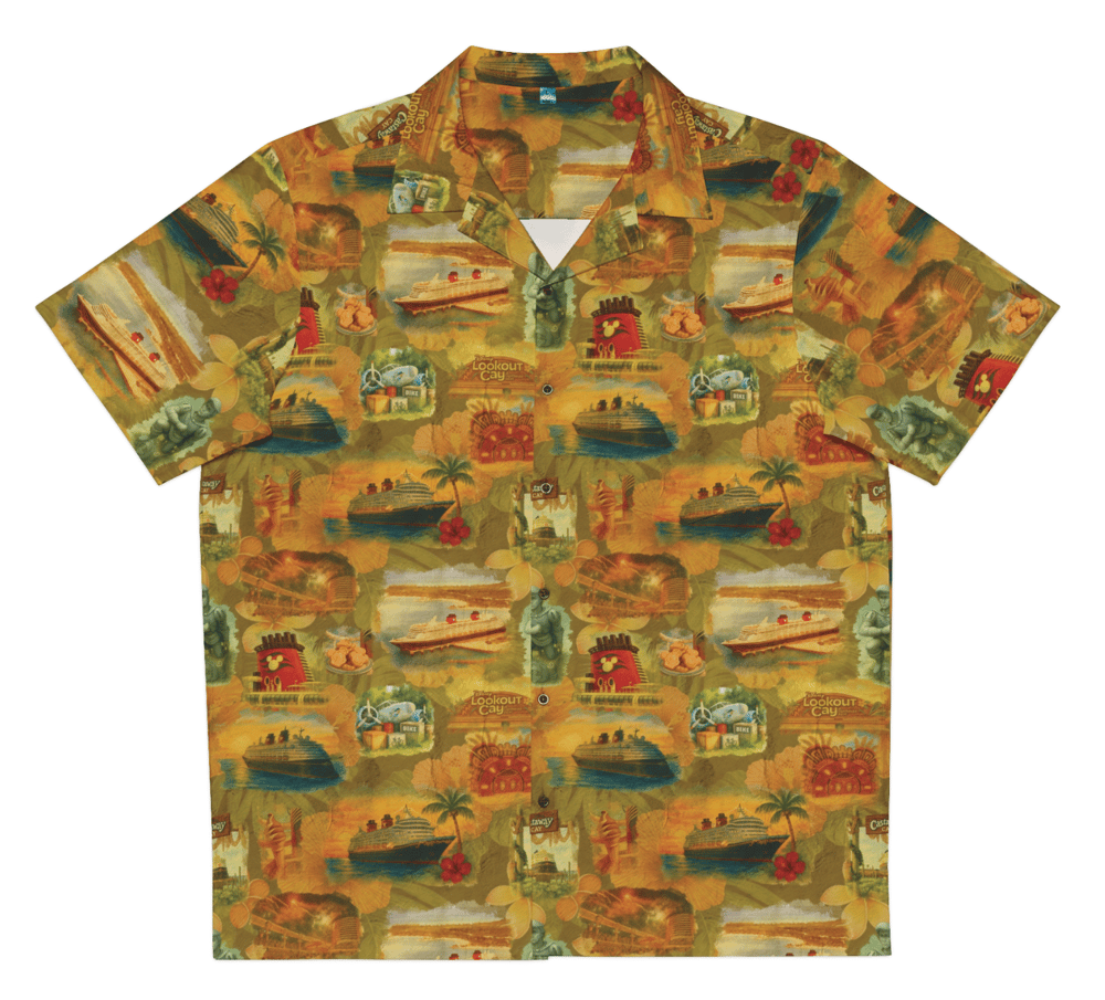 Step out like you just hopped off a 1940s Pan Am Clipper and straight onto a Disney cruise. This custom design draws from the golden-era Hawaiian Aloha shirt style—those warm painterly tones, soft watercolor blends, and vintage island storytelling—mixed with DCL ships, private island destinations, tropical sunsets, and that cruise-day magic we all chase.