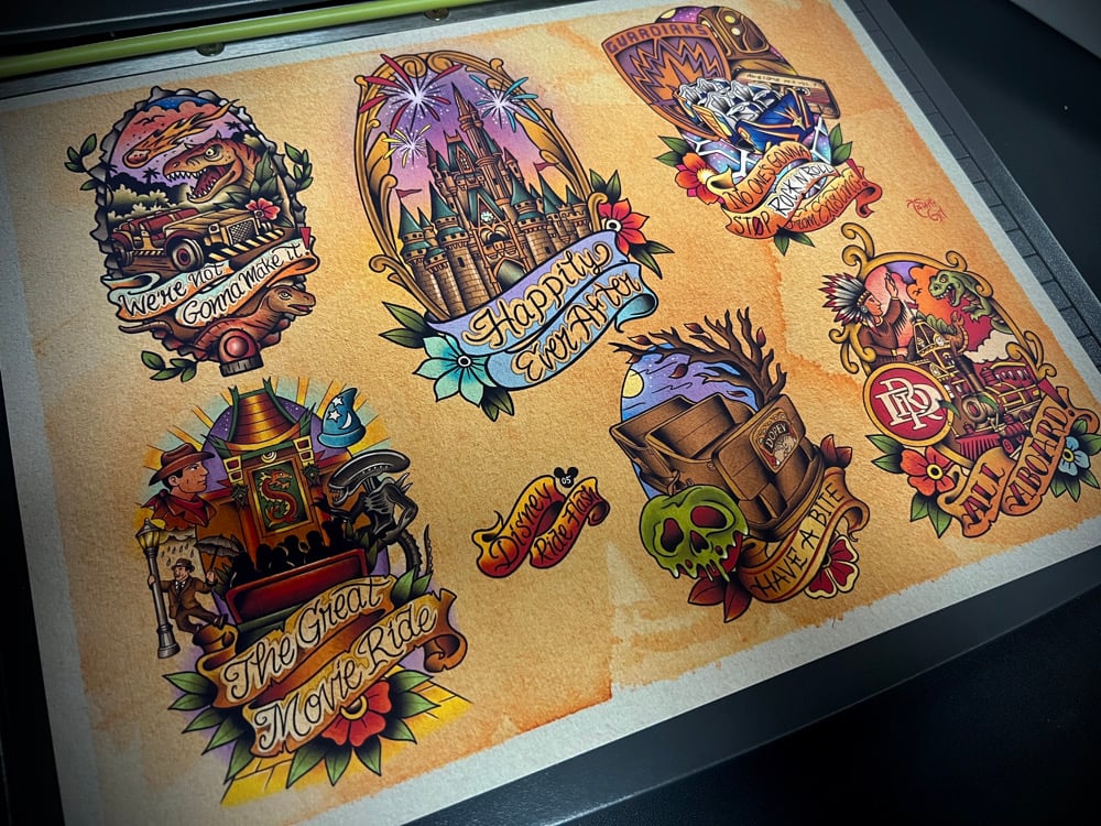 Introducing our Disney-inspired American traditional tattoo flash sheet! This unique collection features designs reimagined with a whimsical Disney twist, drawing inspiration from a variety of vintage tattoo styles. Each piece is hand-cut and measures 11”x14”, making them perfect for framing. Whether you're decorating your tattoo studio or looking for the perfect gift for a Disney or American Traditional fan, these prints will make a striking addition to any space. Crafted on ultra-smooth matte archival inkjet cardstock, the vibrant colors are truly stunning. Add a touch of magic to your collection today!
